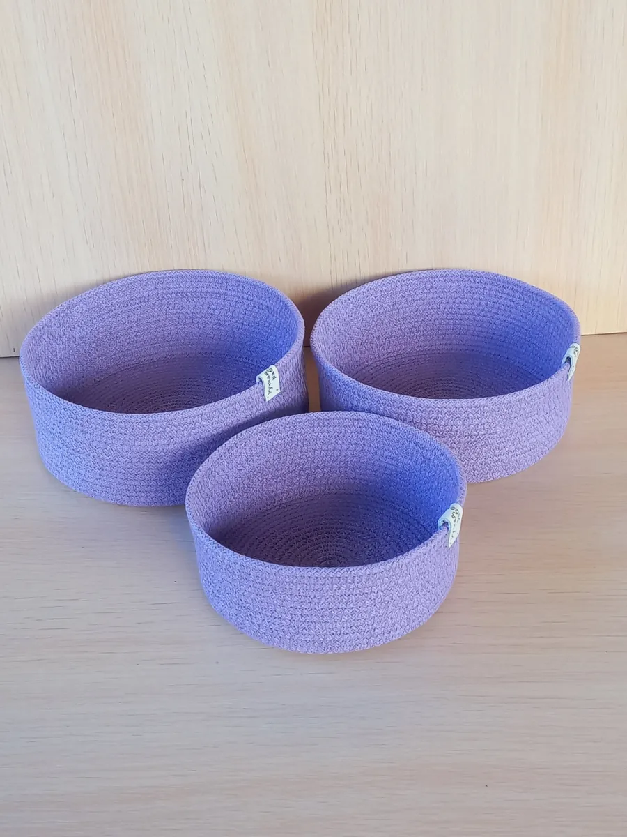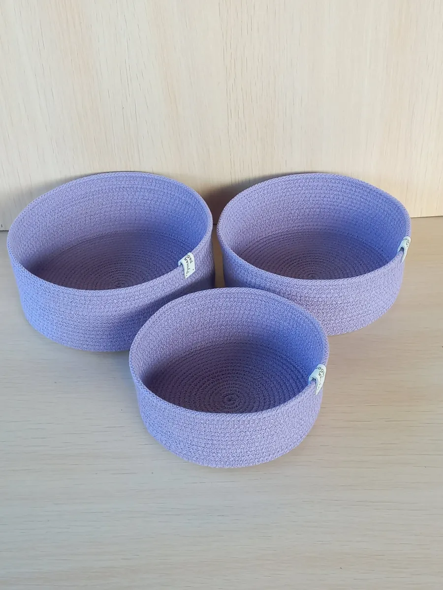 В набор входит три разные корзинок разного размера, что позволяет организовать хранение вещей разного объема и размера. В комплект входит 1 корзинка размером 20*20 см, вторая - размером 18*18 см и третья размером 16*16 см. Например, вы можете использовать большую емкость для хранения фруктов, среднюю - для аксессуаров или косметики, а маленькую декоративную корзинку - для мелочей, которые всегда должны быть под рукой.
