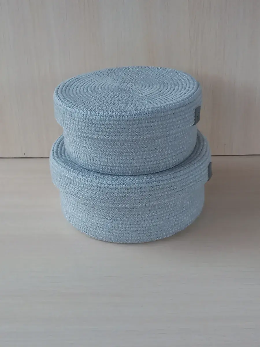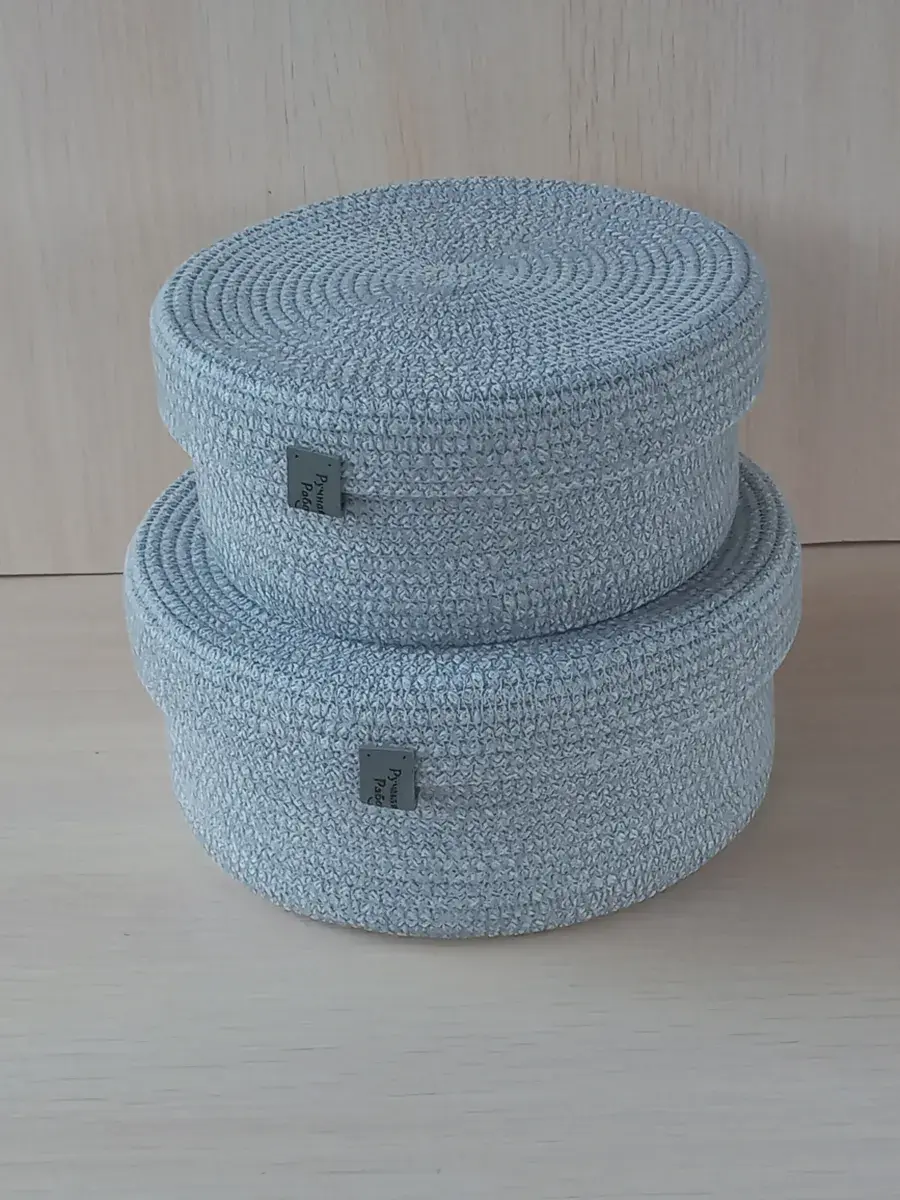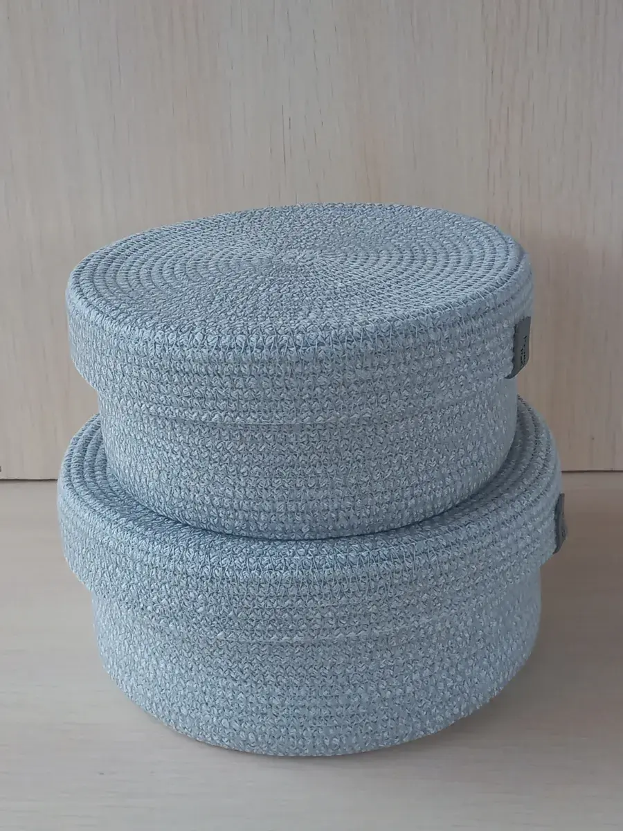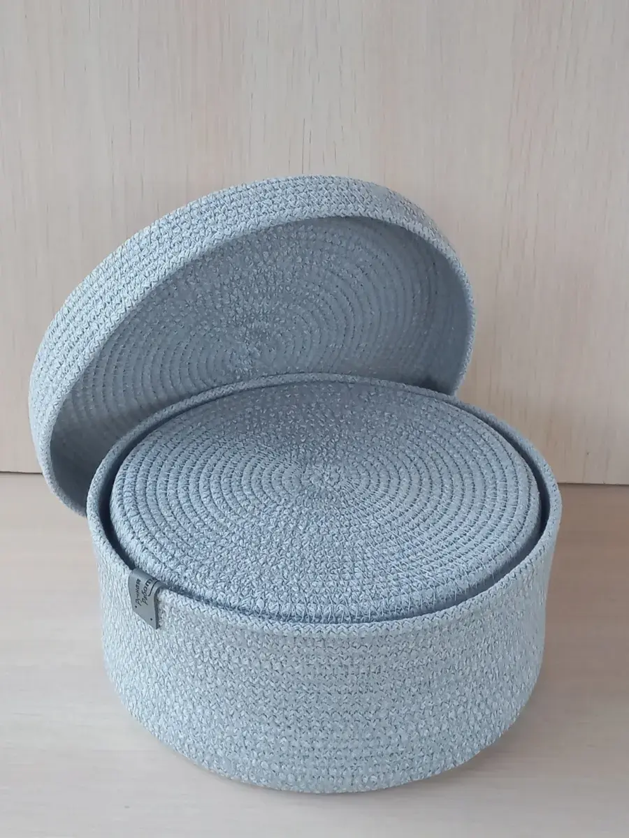 В набор входит две корзинки разного размера, что позволяет организовать хранение вещей разного объема и размера. В комплект входит 1 корзинка размером 20*20 см с крышкой, вторая - размером 17*17 см с крышкой. Например, вы можете использовать большую емкость для хранения фруктов, среднюю - для аксессуаров или косметики, крышки можно использовать как отдельные корзины - для мелочей, которые всегда должны быть под рукой.