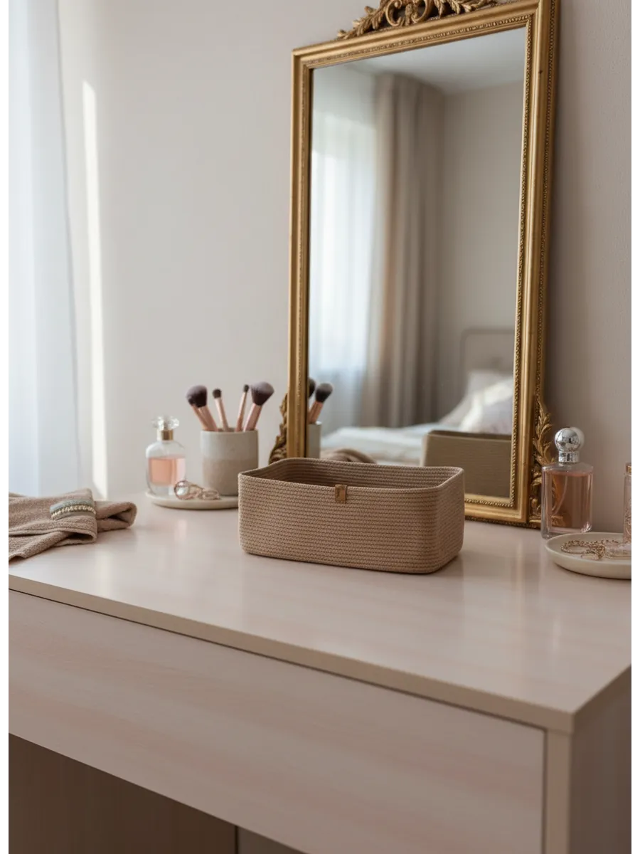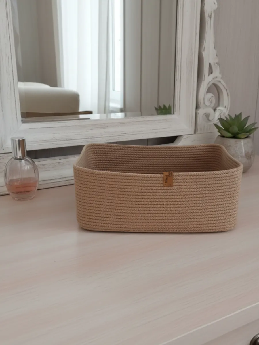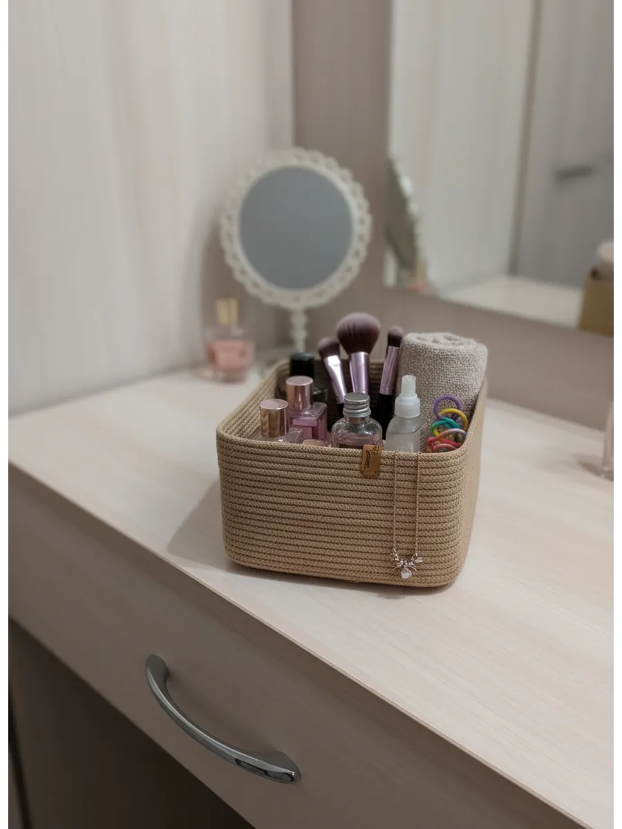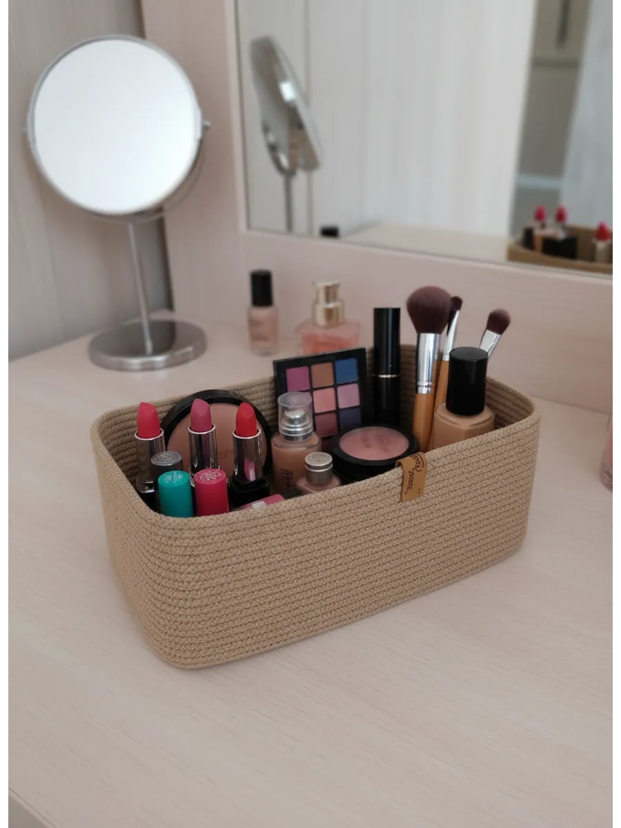 Идеальное решение для организации пространства - плетеная корзинка для хранения! Органайзер для хранения идеально подойдет для использования в ванной комнате, где вы сможете хранить косметику и другие мелочи в удобном и компактном органайзере.