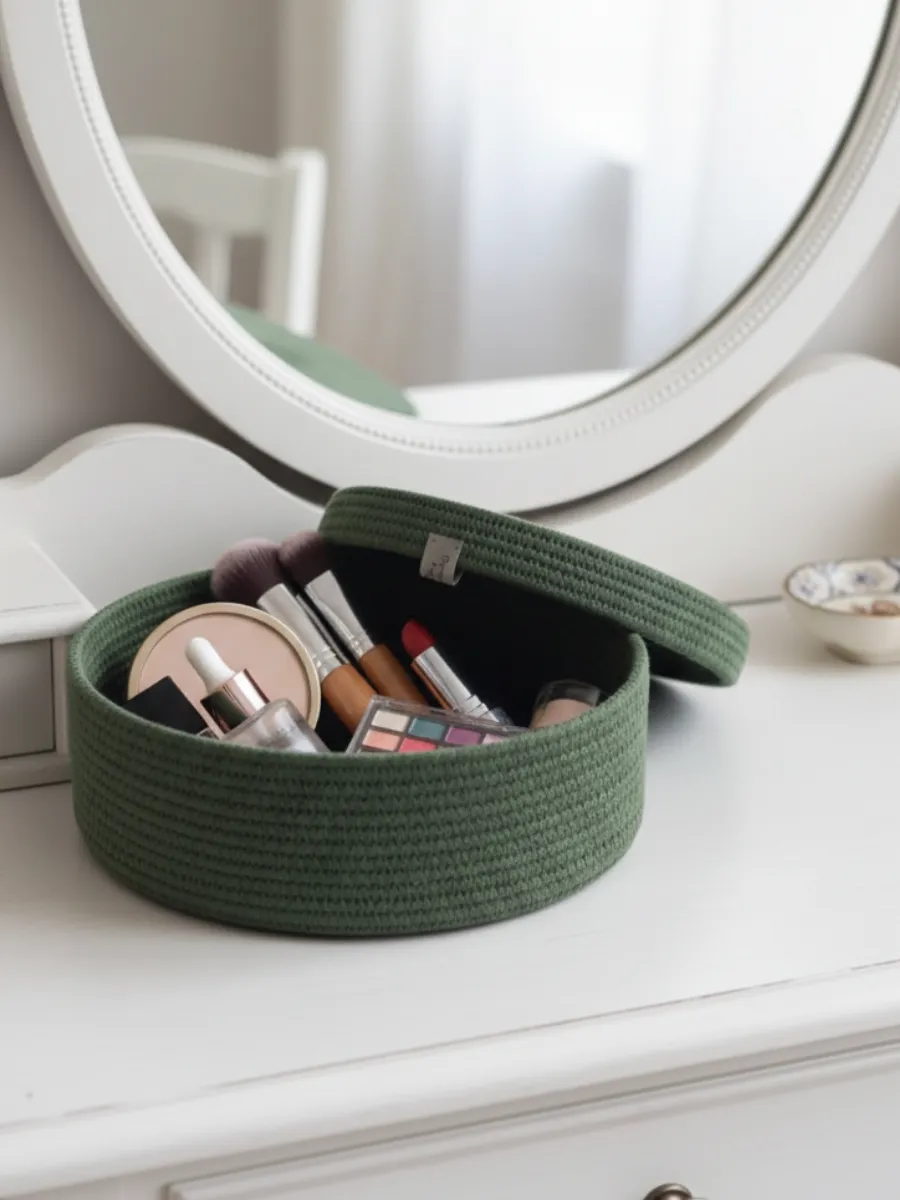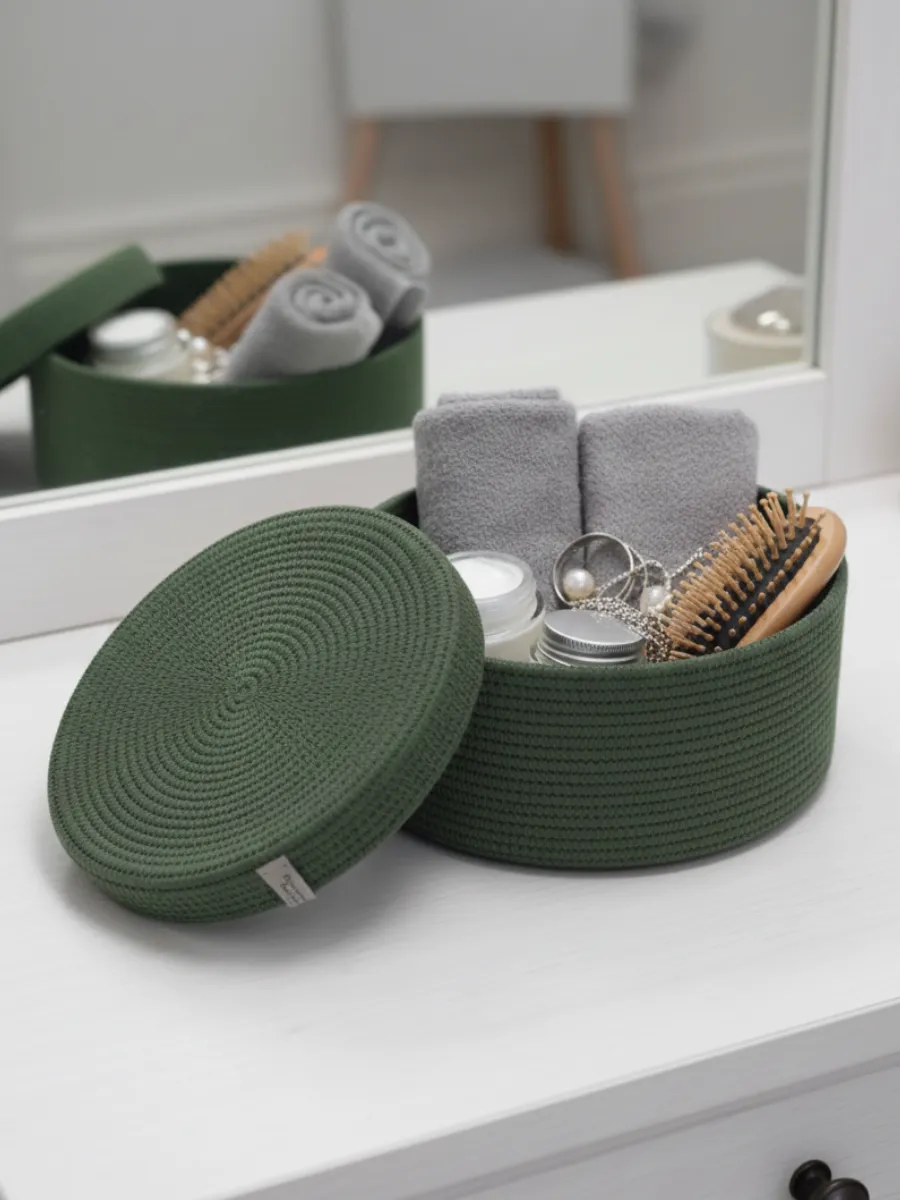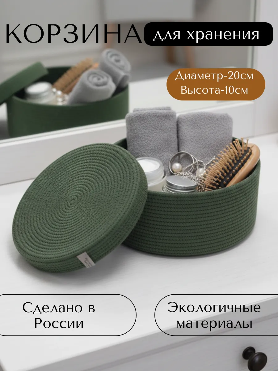 Плетеная интерьерная корзина дополнит систему хранения вашего дома.Корзинка изготовлена из хлопкового шнура 5 мм за счёт чего отлично держит форму.Корзиночки можно использовать для хранения швейных принадлежностей косметики, а также товаров для рукоделия/ канцелярии пряжа . Корзина подойдет в качестве прекрасного подарка на любой праздник от свадьбы до дня рождения . Возможны расхождения размеров в пределах 1.5 см. Корзина плетеная с крышкой.