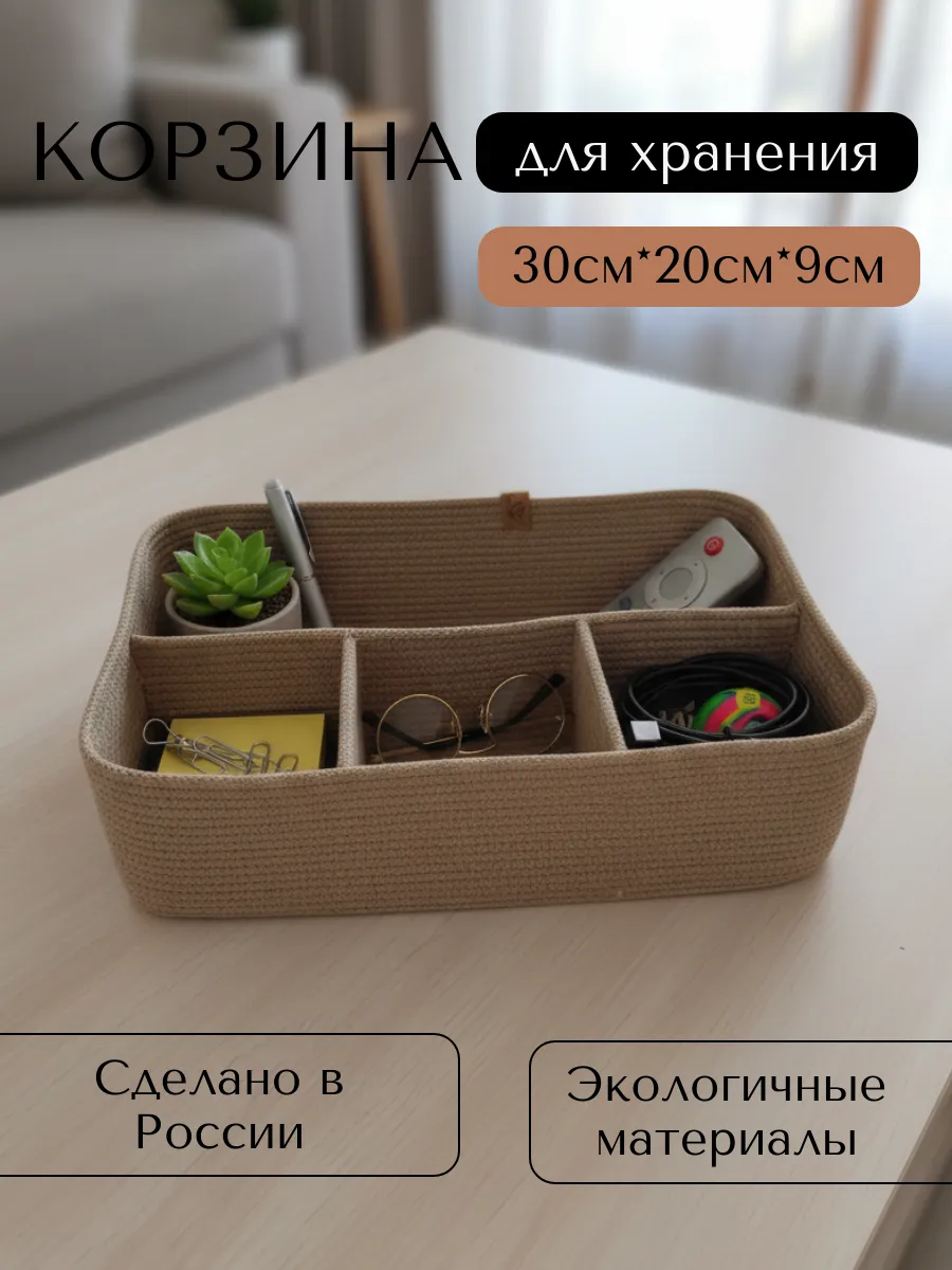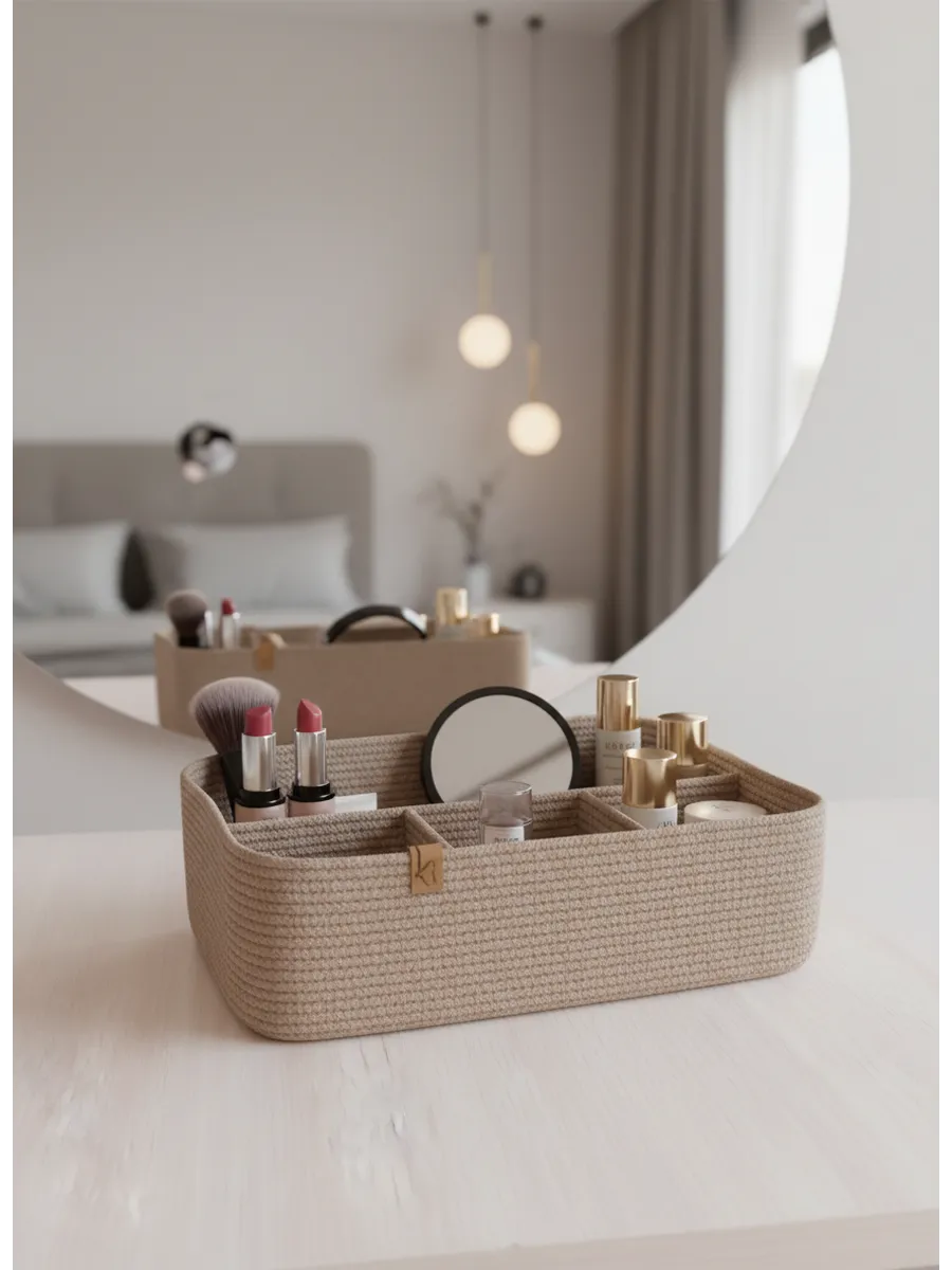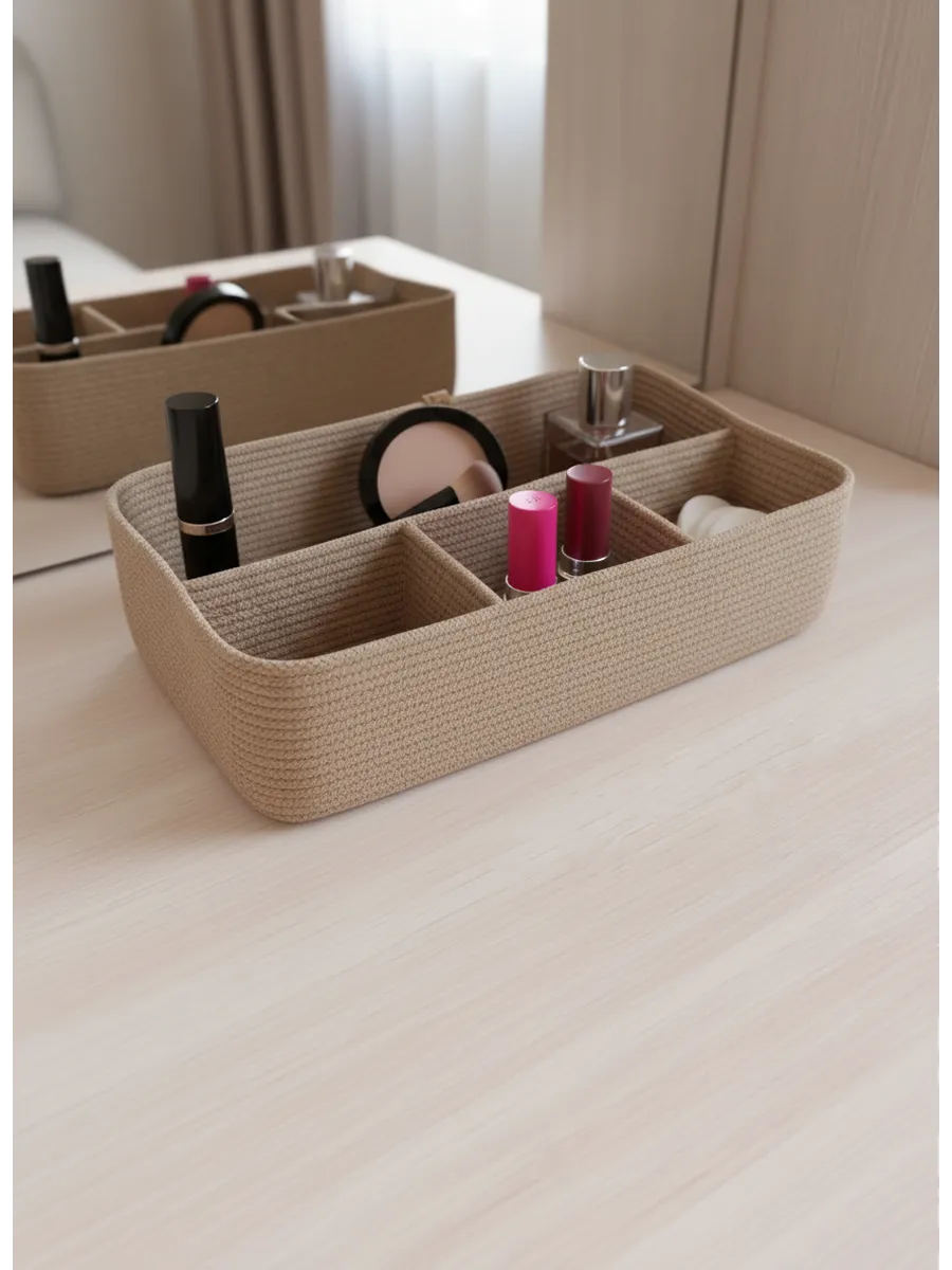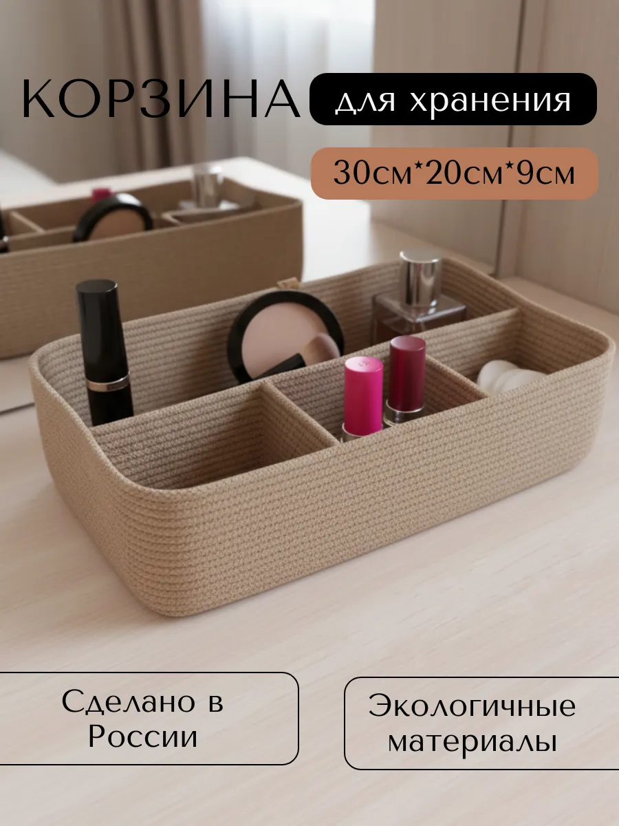 Идеальное решение для организации пространства - плетеная корзинка для хранения! Органайзер для хранения идеально подойдет для использования в ванной комнате, где вы сможете хранить косметику и другие мелочи в удобном и компактном органайзере.