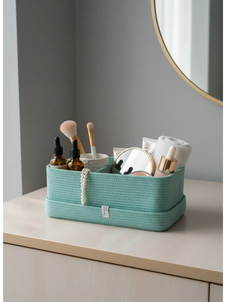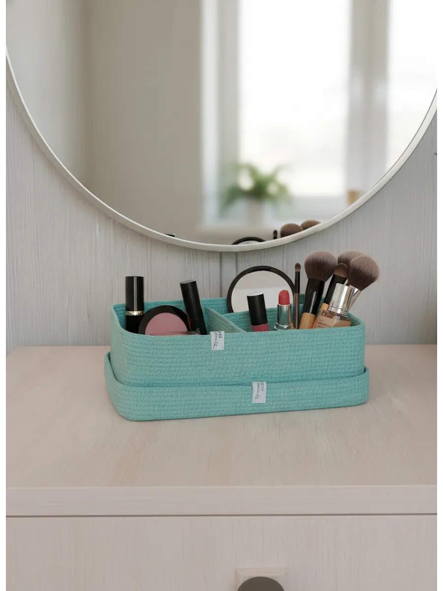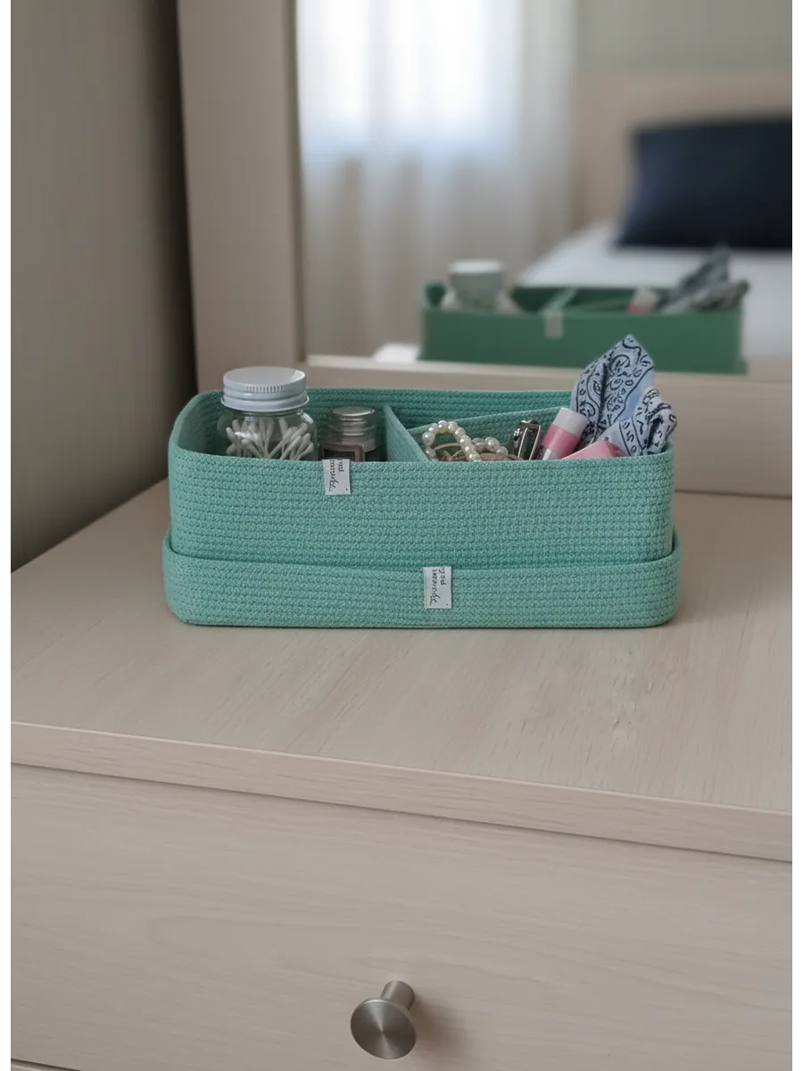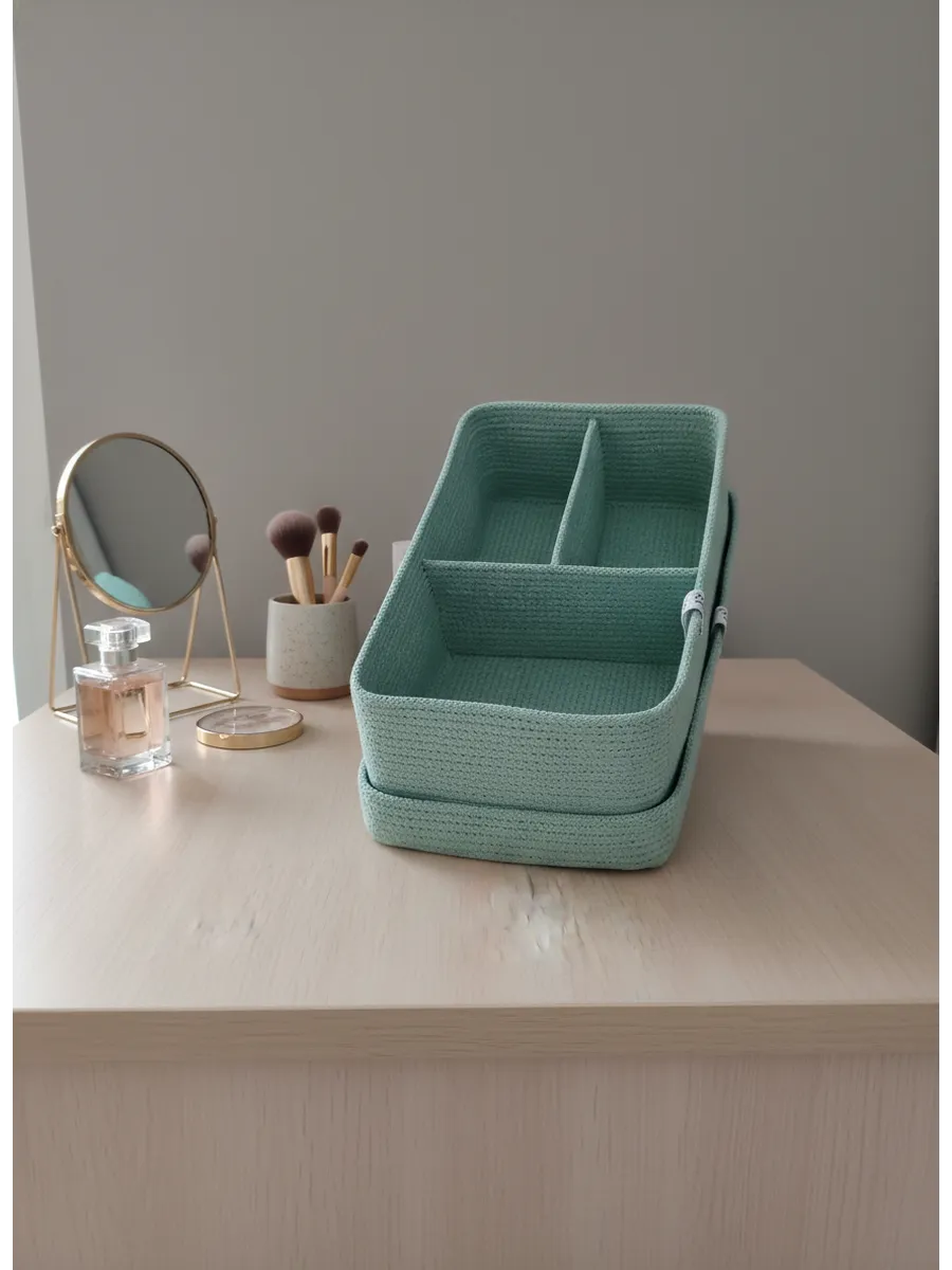 Идеальное решение для организации пространства - плетеная корзинка для хранения! Органайзер для хранения идеально подойдет для использования в ванной комнате, где вы сможете хранить косметику и другие мелочи в удобном и компактном органайзере.