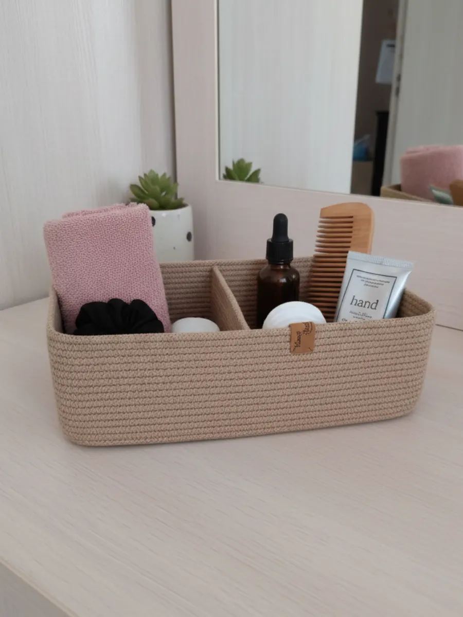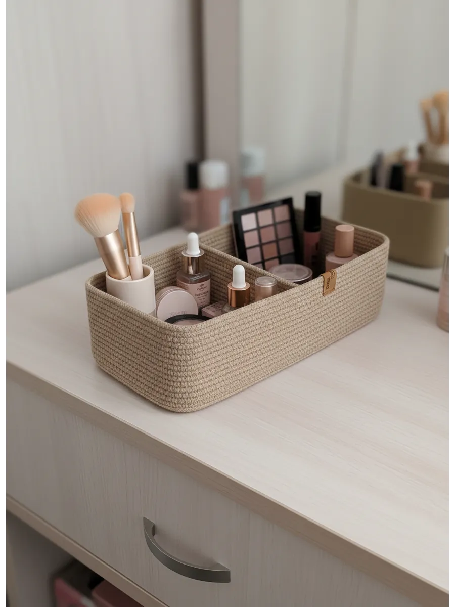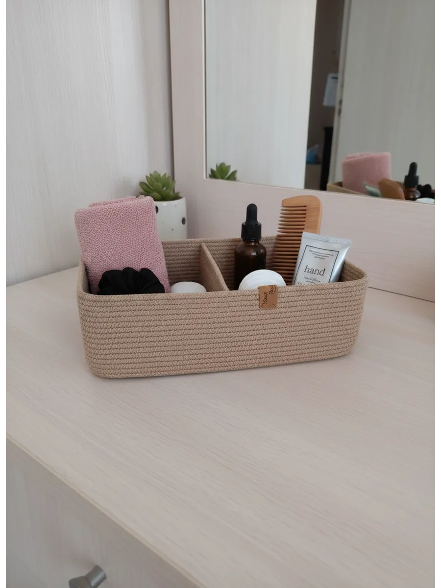 Идеальное решение для организации пространства - плетеная корзинка для хранения! Органайзер для хранения идеально подойдет для использования в ванной комнате, где вы сможете хранить косметику и другие мелочи в удобном и компактном органайзере.