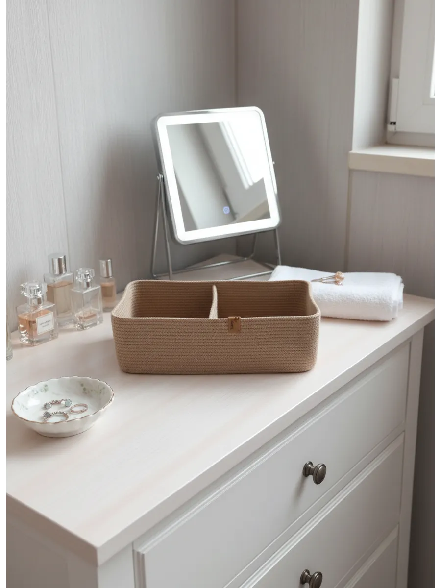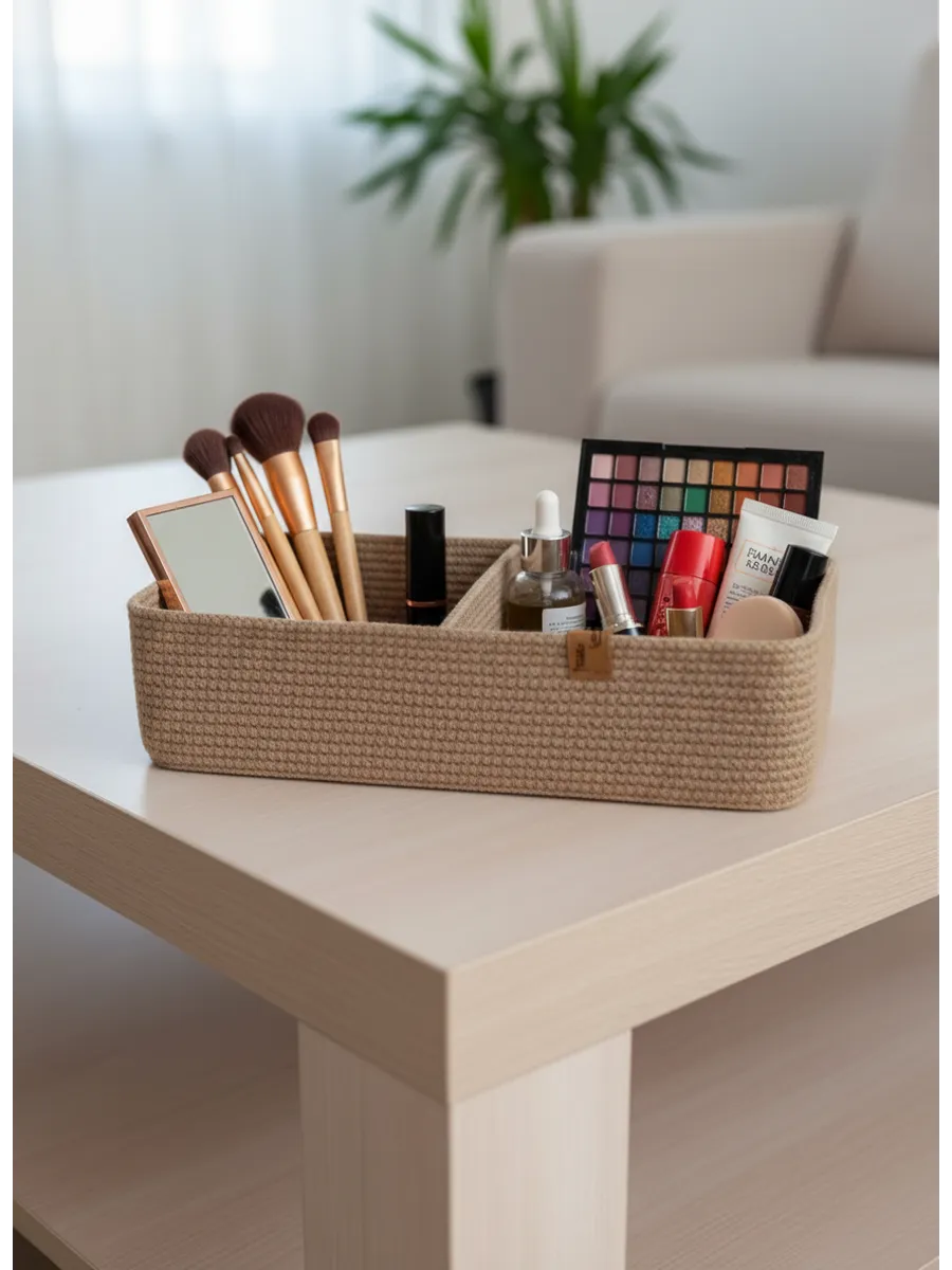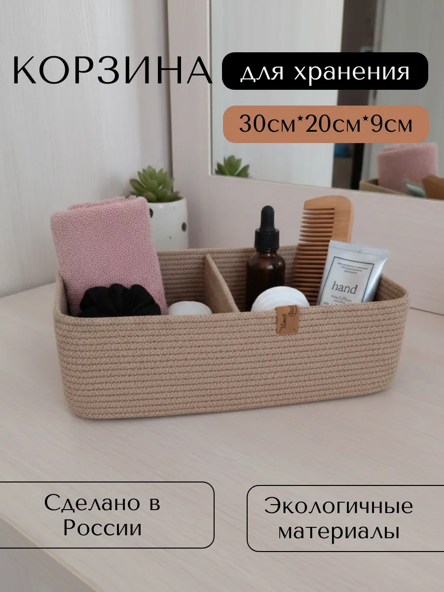 Идеальное решение для организации пространства - плетеная корзинка для хранения! Органайзер для хранения идеально подойдет для использования в ванной комнате, где вы сможете хранить косметику и другие мелочи в удобном и компактном органайзере.