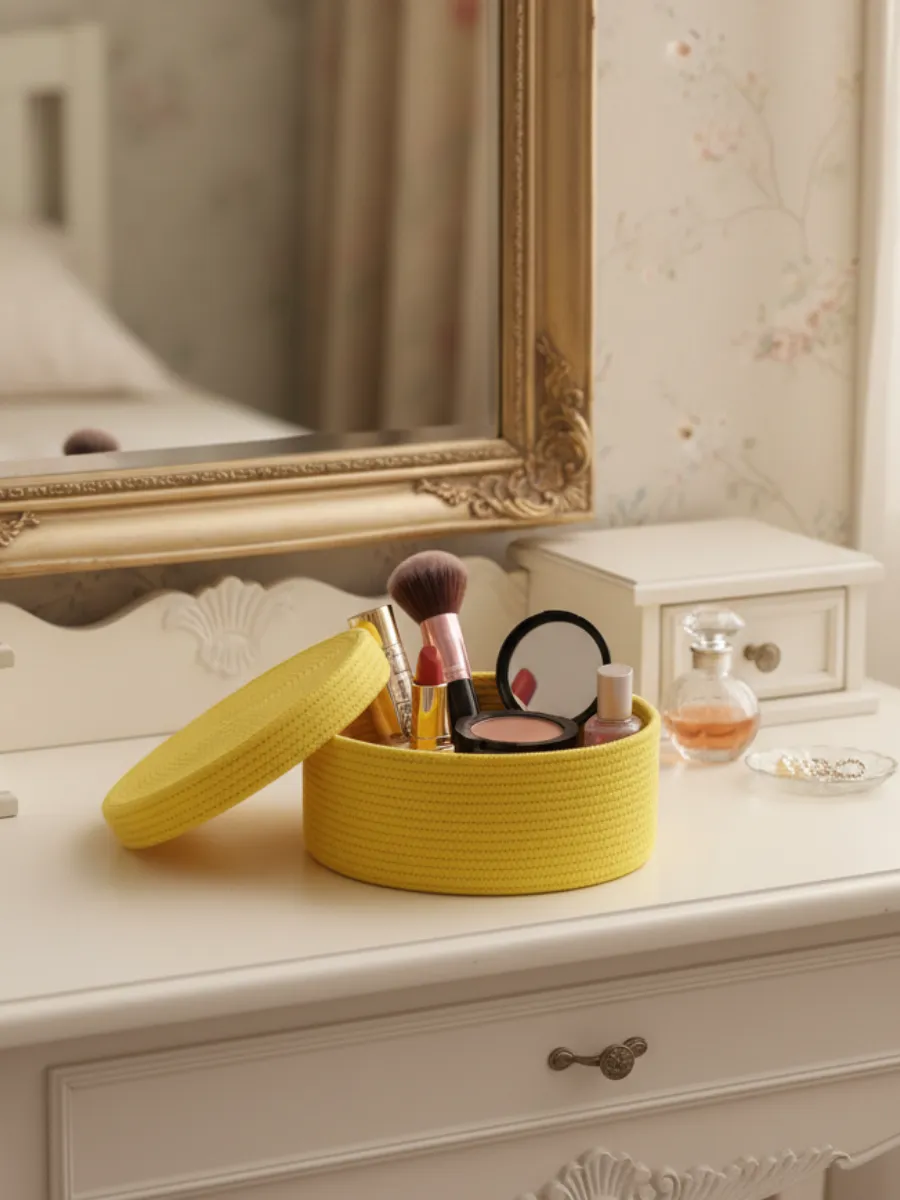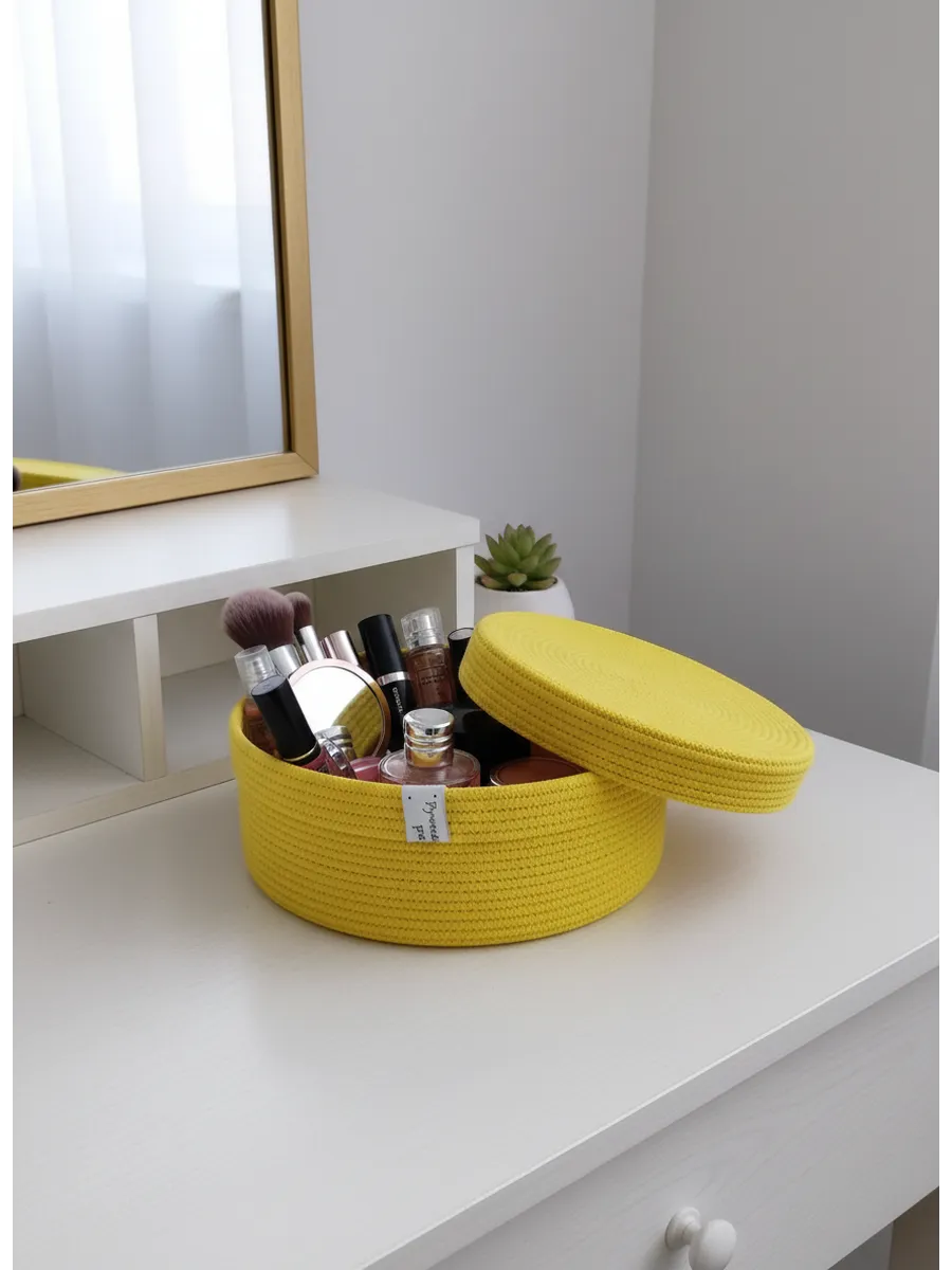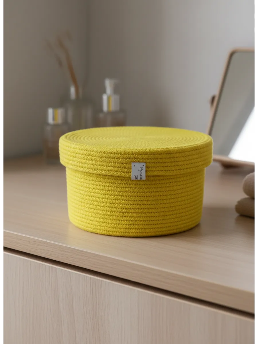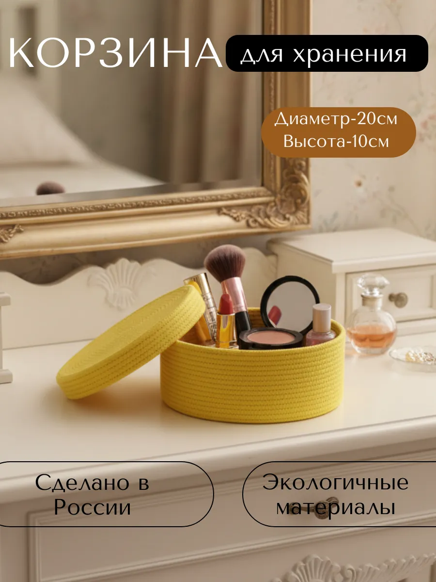Плетеная интерьерная корзина дополнит систему хранения вашего дома.Корзинка изготовлена из хлопкового шнура 5 мм за счёт чего отлично держит форму.Корзиночки можно использовать для хранения швейных принадлежностей косметики, а также товаров для рукоделия/ канцелярии пряжа . Корзина подойдет в качестве прекрасного подарка на любой праздник от свадьбы до дня рождения . Возможны расхождения размеров в пределах 1.5 см. Корзина плетеная с крышкой.