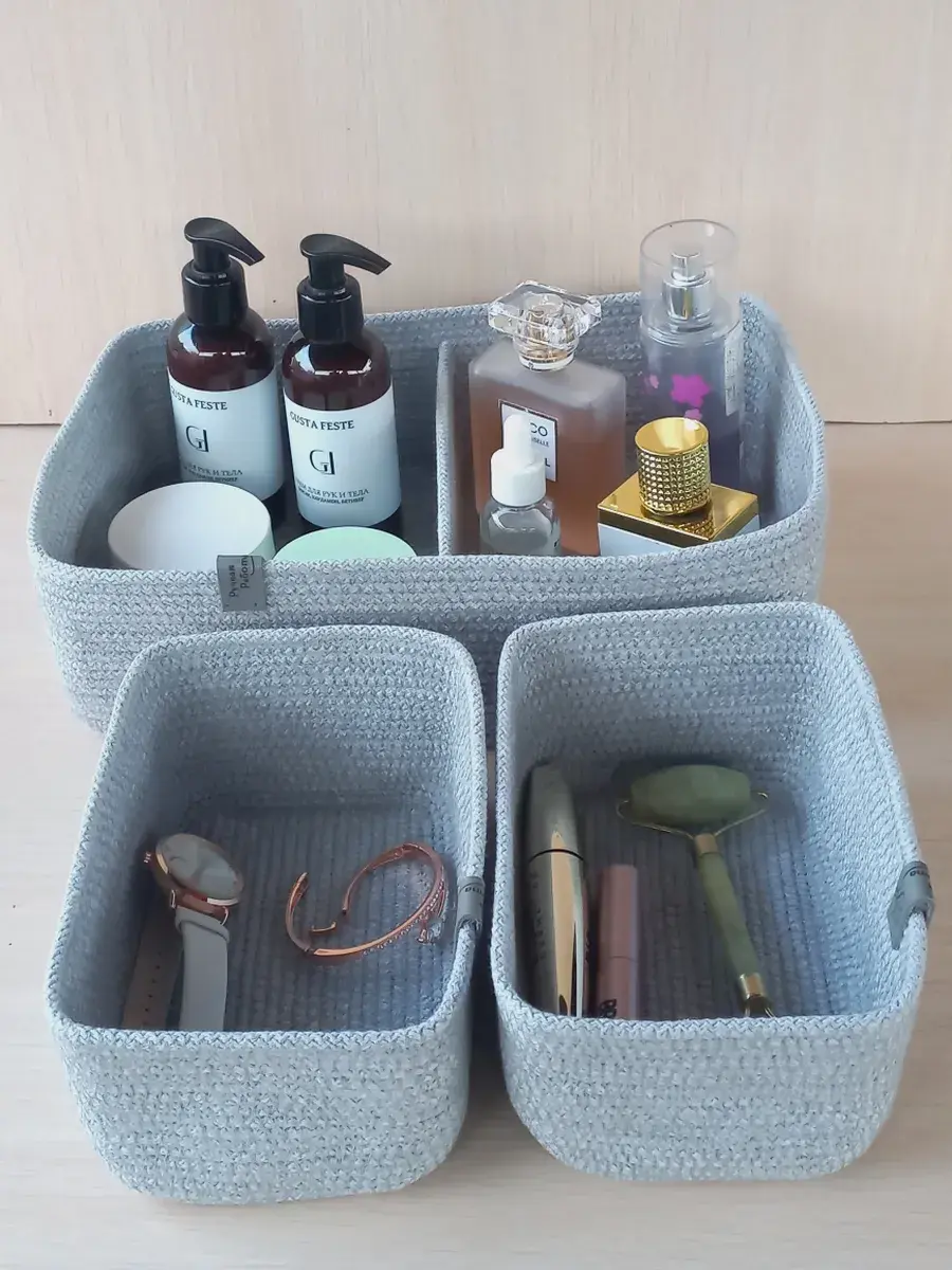 Идеальное решение для организации пространства - плетеная корзинка для хранения! Она станет любой корзинкой для мелочей. Органайзер для хранения идеально подойдет для использования в ванной комнате, где вы сможете хранить косметику и другие мелочи в удобном и компактном органайзере.